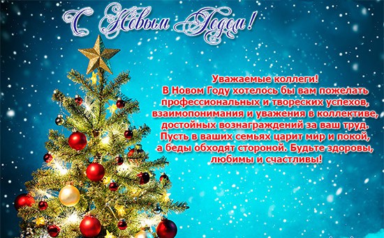 Дорогие коллеги! Примите самые искренние поздравления с Новым годом! Пусть грядущий год будет наполнен творчеством, благополучием и семейным счастьем. Желаем вам и вашим близким крепкого здоровья, бодрости духа и успехов во всех начинаниях.