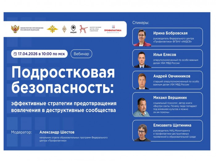 Ссылка для подключения к вебинару. 👉 Программа вебинара. Кому будет полезно: ✅ Специалистам органов и учреждений системы профилактики ✅ Сотрудникам школ, колледжей и вузов ✅ Родителям подростков ✅ Всем, кто работает с молодежью Присоединяйтесь, чтобы получить рабочие инструменты защиты от деструктивного влияния и укрепить контакт с подростками. Организаторы: МВД России, Минпросвещения России, Федеральный центр «Профилактика» ФГБНУ «ИИДСВ».